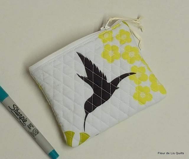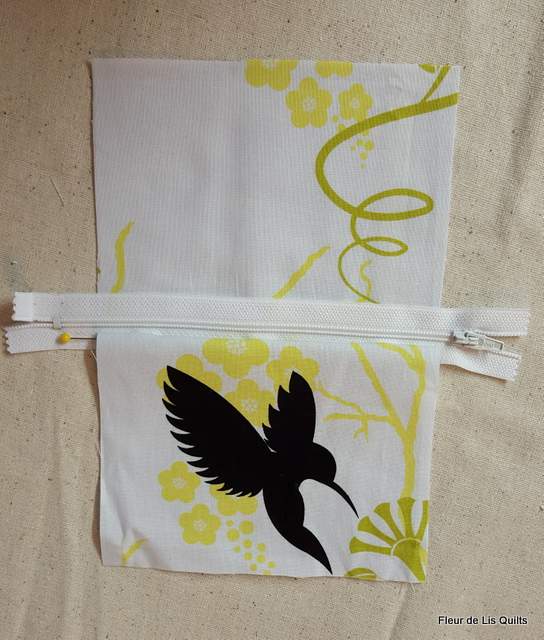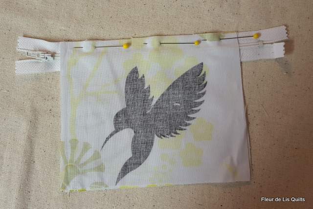 I pinned the pieces in place then turned down the outside fabric so that I could check the hummingbird. I also checked to make sure the zipper was facing in the right direction. The zipper pull, or slider, needs to be on the same side as the outside fabric.