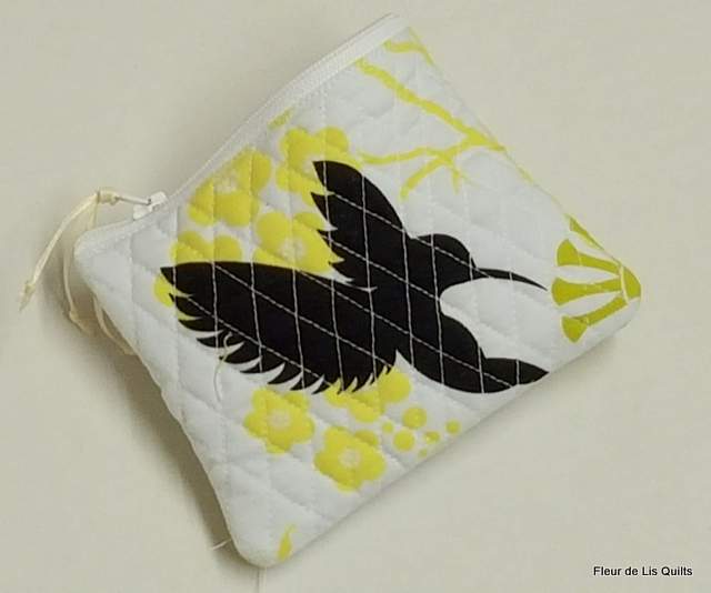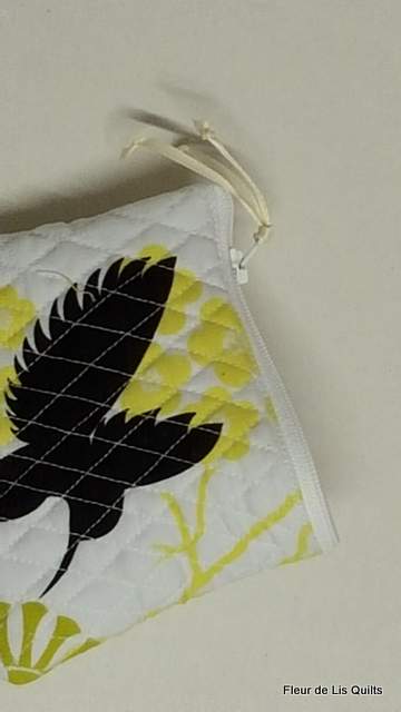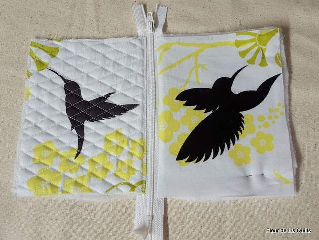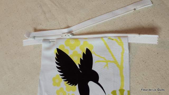 My fabric is a one-direction fabric, which means that I had to be extra careful to make sure the birds were flying right side up. You may have noticed that the zipper is centered in the fabrics and that the top and bottom stops are far from the fabrics. This is to be able to fold and sew the excess zipper down into the purse cutting it.
