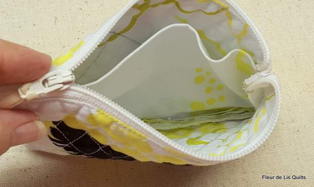 10. SEW Close the purse by folding in half along the zipper, rst, and add the divider. Tip: the folded edge should be closest to the zipper. Adjust the divider so that it is about 1/2 inch from the zipper. Trim the raw edge on the opposite side, if necessary. Pin all around. Begin sewing about 1/2″ from the zipper. Sew around the perimeter of the purse. Be careful to catch all the layers.