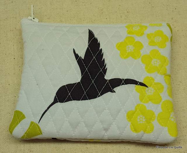 Again, I pinned both the outside and the lining so that the zipper tape lined up with the edge of the fabric and checked the orientation of the hummingbird. This time I also checked to make sure that the fabrics lined up. I am a smidge off (gosh, it looks much worse!) but let it alone–the side seam can accommodate a smidge. (Now finished, the purse looks great.)