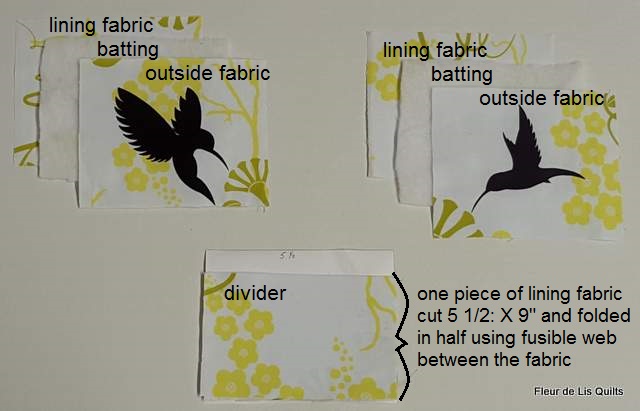 9. SEW Sorry, I forgot to take a picture of the divider. It’s optional though easy to make. To create a divider I cut a piece of coordinating lining fabric 5 1/2″ x 9″ and folded it in half, wrong sides together (wst). Add a layer of fusible web and press at high heat.