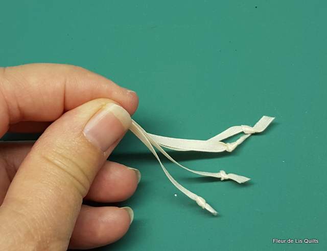 14. RIBBON PULL Using two pieces of small, coordinating ribbon, Tie the individual ends of the ribbon and fold in half. Finger press tightly.