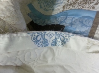 Repeat the process as you attach binding completely around the quilt.  When you get to the point at which you began, stop about 8 inches from the first stitch. You will need to measure and connect the binding ends to finish stitching it to the backside of the quilt.