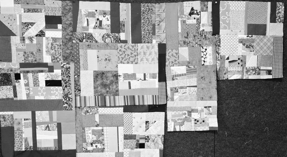 Here’s a tip to answer that question: change one of your photos into black and white, then analyze whether the colors are balanced. I’ll include a few more darks to this top, but otherwise, I’m satisfied for now. I’ll check again before sewing the final chunks together. Adding a strip of black or light green is an easy fix, if I feel something more is needed.