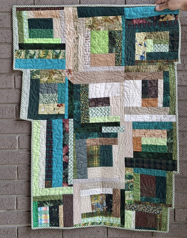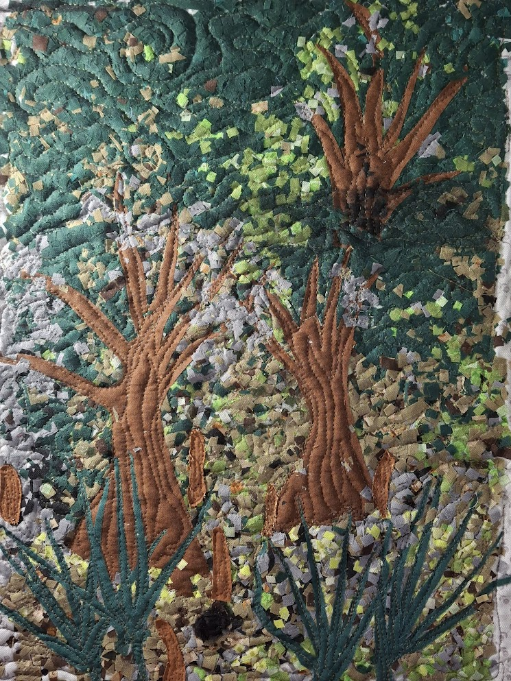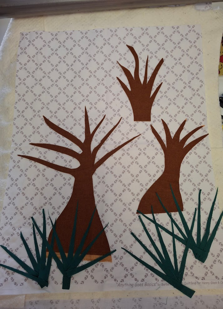 Play was fun and easy. I knew I’d do something a little dark and mysterious, so I pulled out dark green and brown fabrics. Palmettos grow in large clumps in just about any piece of land you can imagine. (There are some on my driveway.) They don’t really grow in water, but the water’s edge can be overrun with them. Walking through a dense thicket can be dangerous for both the sharp edges of the palms but more so for the snakes that love to bed down in the center of the clumps. So, I had to have palmettos, which meant lighter browns.