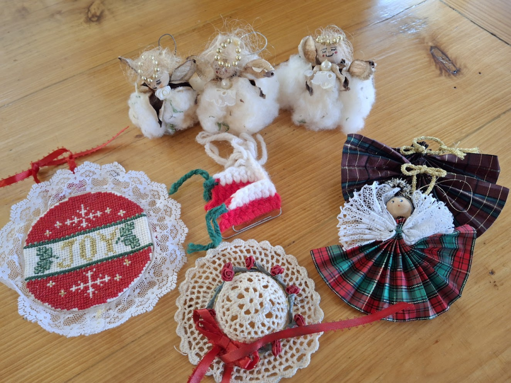 At the very top of this photo are three cotton-boll angels from a friend, right below is a pair of skates my sister crocheted about 46 years ago. The “JOY” ornament is one I made to trade ornaments with her. The angel on the right is from my aunt. She and my uncle visited my parents one Christmas. The hat is a cheat–the hat is from a junk store and decorated with little roses and a red ribbon.