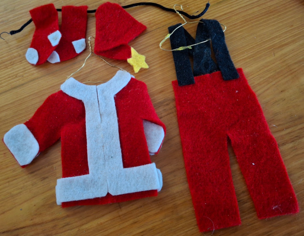 This set of Santa’s clothes is precious but old. Eventually, I will make another set. It’s just felt, glue and wire for the hangers. Yes, the hangers are handmade. You can print this pattern at the size you want. (My little jacket is only about 3 inches from top to bottom.)