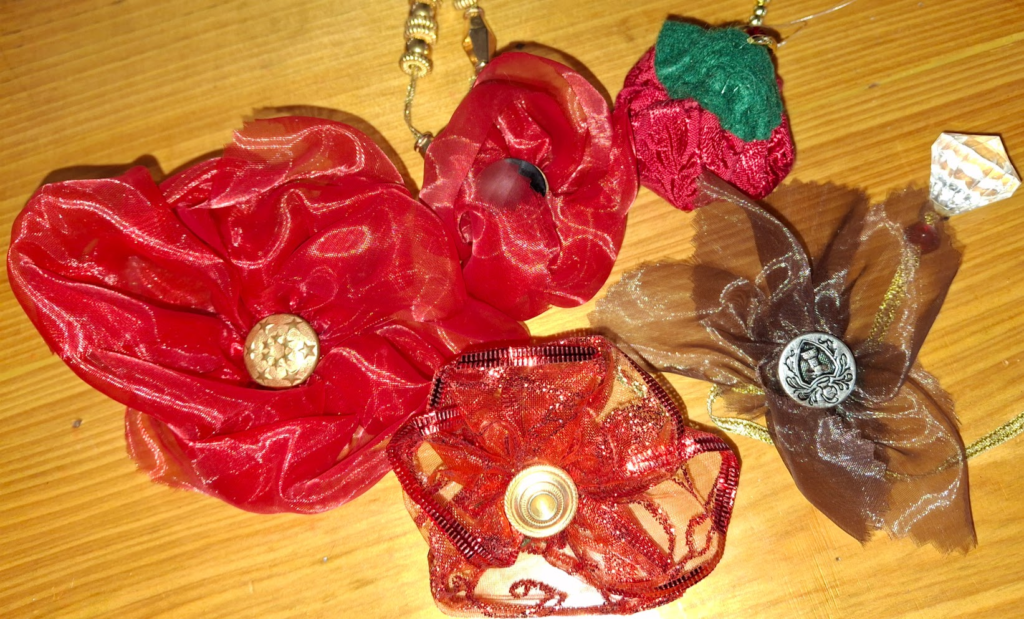 One year, I played with shiny white satin. Satin is difficult and fiddly but, knowing this, I cut everything with pinking shears. Two birds, a flower bud and three hearts.