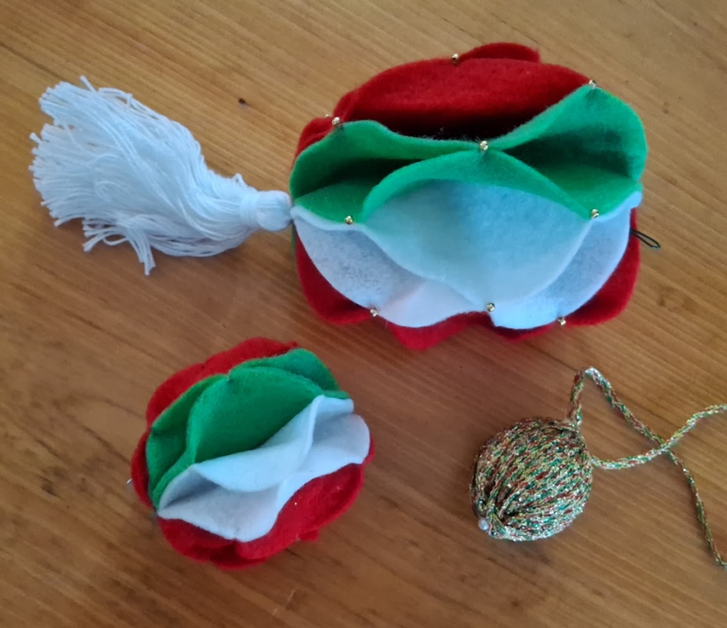 I have four of the round felt balls, two in each size. I put the large ones on the lowest branches. The third ball is small, just a foam ball wrapped with glittery yarn.