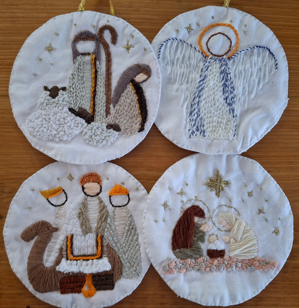 Last year, I bought a kit from Amazon and embroidered these large nativity scenes. This year, I added a few little details so they would show more. The angel, for example, blended into the background. This tiny bit of blue makes such a difference. I also added stars using metallic thread.