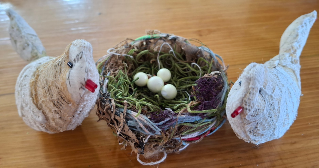 Yes! I this little bird is handmade. Using lots of school glue, thread and Spanish moss, and who knows what else. Wanting it to look like a bird nest, I added these little air-dry clay eggs. Then, because the satin birds above are too big, a few smaller birds joined the crew. They are from old lace stitched onto cotton fabric and a couple of beads.