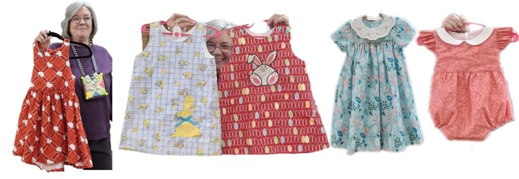 Oops, I digress. Back to the Show and Share. This month we had all variety of finishes beyond quilts. It’s always interesting to see what someone has created. Let’s start with the garments my friend made. The are adorable! I found myself wishing I had a little grandie to wear these!