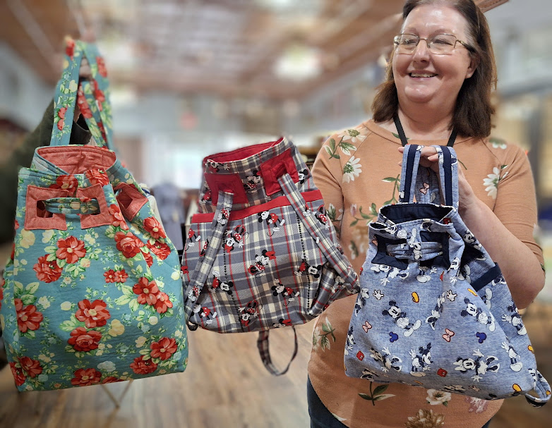 The bins I made years ago for the old studio are still working in this one! Prints with lots of colors have always been a organizational problem for me. Background colors have been the biggest factor in my decision-making. I’ve also tried to solve it by separating novelty fabrics into a separate theme, but that hasn’t helped. So now I take a different approach. I decide where a particular scrap should go based on color and use. For example, all four of the pieces below are children’s novelty and, obviously, the two on the right could go into the pink bin–though the one with the white background might also fit in a white group.