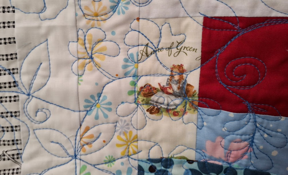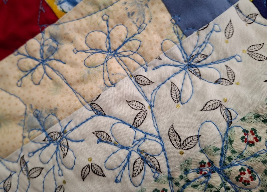 I imagine a preteen girl would appreciate the book. However, the quilt blocks have many hard lines, so I decided to soften those edges with flowers, vines, leaves, and berries. Even mushrooms! I had great fun quilting this one. In fact, it’s one of my favorites. I’ve taken 20+ pictures and videotaped tight shots of the motifs to easily review them later.