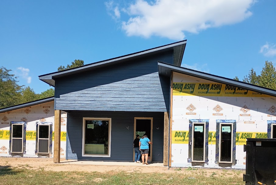 My sister Laura and her husband, Gary, just finished building a house on the land where we grew up in Plaucheville. It’s the cutest house built in the style of Frank Lloyd Wright, a famous architect from the 1950-60s era. Very Mid-Century Modern. Laura became a fan when she toured a couple of his houses. One of them in Crystal Bridges, Arkansas, when she and her daughter visited. I was a tag-along on that trip. What a lucky person I am to be invited.