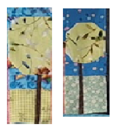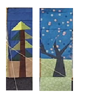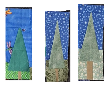 The process is slow because I decided to use up some of the scraps that are loitering all over the studio. So, first, gather them up. Then improv them into treetops. Find sky and grass. Oh, don’t forget the tree trunks. Trees look odd without trunks. Sure, some grow with limbs touching the ground, so you can’t see the trunk, but it doesn’t translate well into fabric. Anyhoo, these five above are all made from improv blocks that I trimmed into tree-like shapes. They are based on…