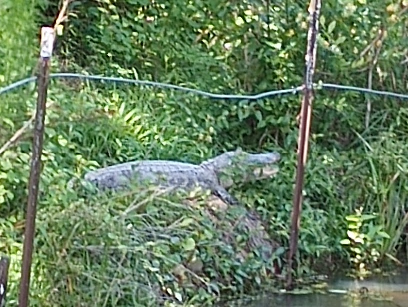 Checking on his parents’ old place yesterday, Richard visited a momma alligator guarding about 20 babies. (Read more about alligators from the Louisiana Dept. of Wildlife and Fisheries here.) She has a few babies from last year’s pod and several from this spring. Of course, the photo is not good, but he’s willing to get only so close to that pond. She’s a squatter and will not give it up without a fight. The older babies are now about 18 inches long and may spend another year in the nest, but we won’t see them after this summer. The younger ones are only six to eight inches and have at least another year with momma before finding their own hunting grounds. This pond is too small to support more than one family.